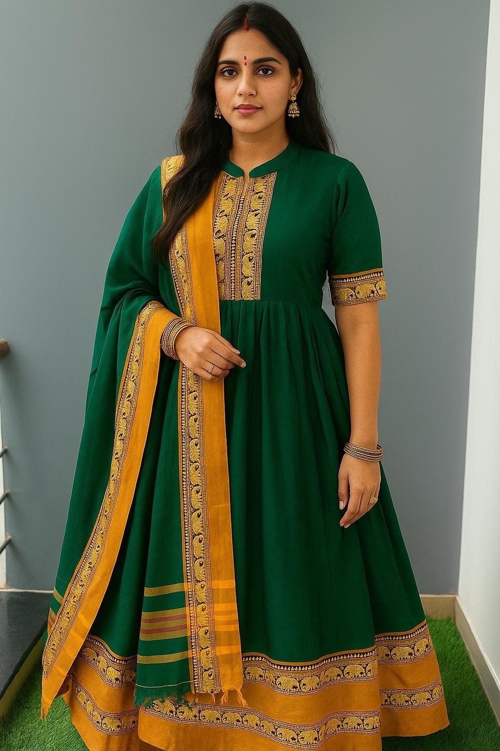 Turn heads with this graceful emerald green Anarkali suit, beautifully paired with a mustard-gold dupatta. Designed with intricate woven borders and elegant detailing, this outfit is the perfect mix of tradition and modern charm.