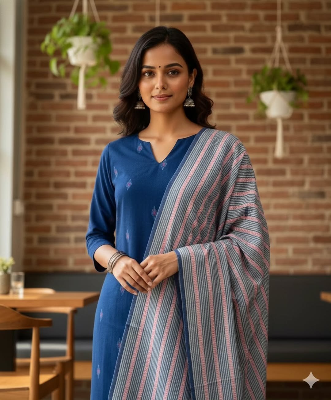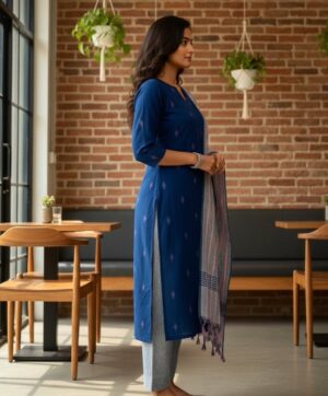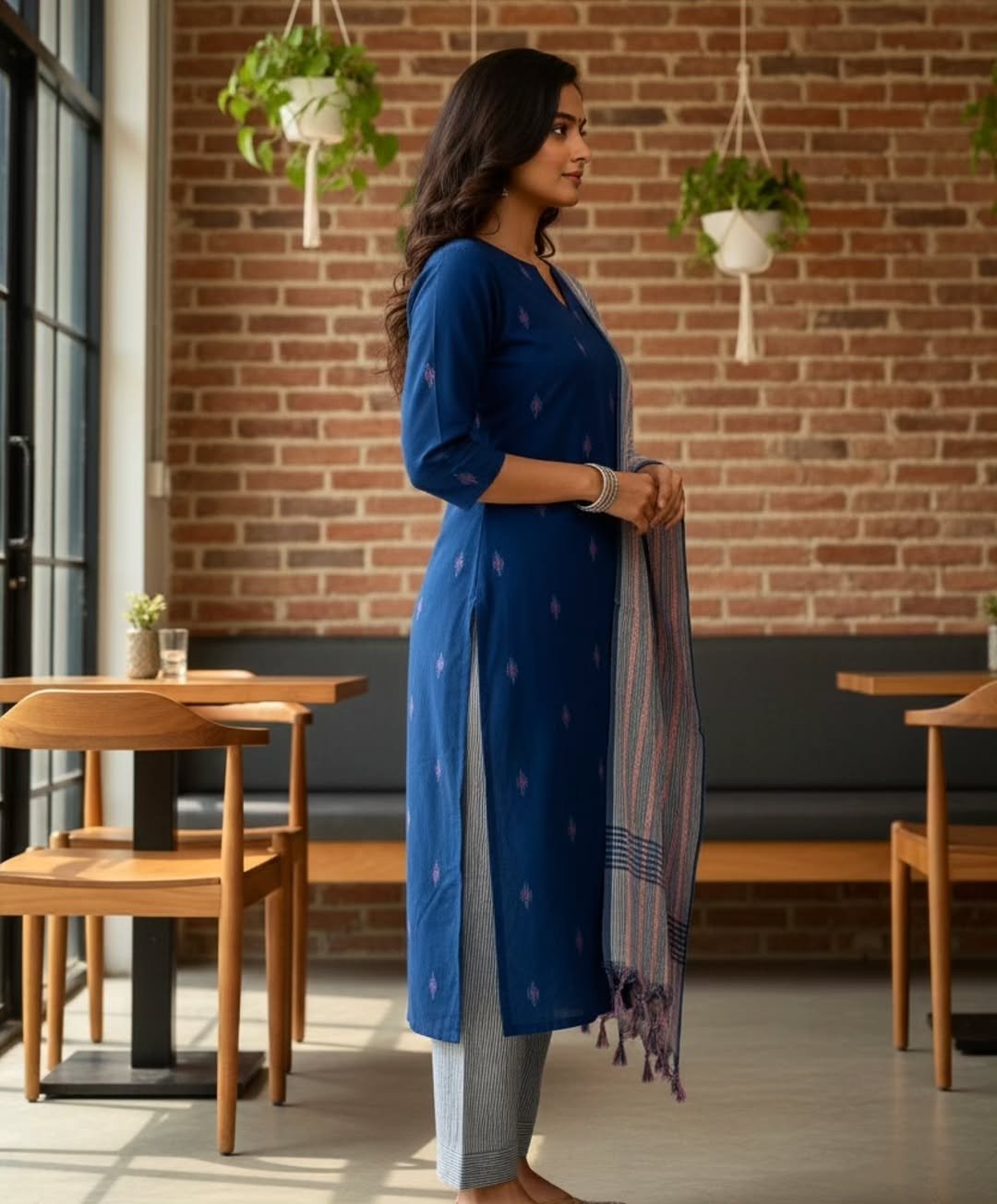 The breathable cotton kurti, paired with the soft striped dupatta, creates a polished look that’s perfect for office, college or everyday wear. It’s lightweight, easy to carry and makes you look instantly put-together — without trying hard.