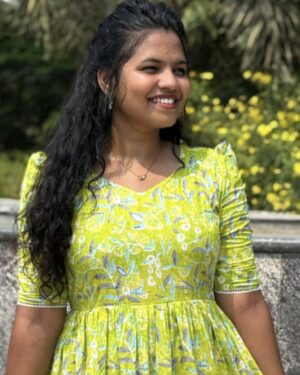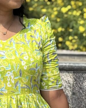 Your new go-to for casual days—this green dress with grey and white leaf prints is lightweight, easy to wear, and full of fresh style. The standout star neckline adds a unique touch, while the puffed elbow-length sleeves with lace detailing bring a soft, feminine finish. Made from breathable cotton, it’s the ideal choice for warm days, weekend outings, or simply feeling good in your everyday look.