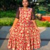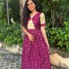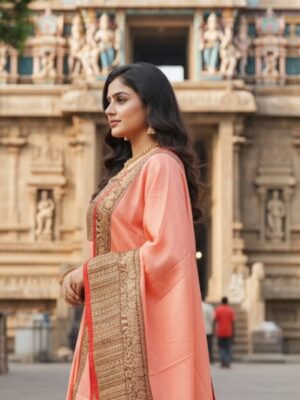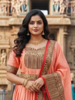 Bring home the charm of South Indian tradition with this peach ethnic gown set from Raspberry by Gayathri. Designed with a flattering silhouette, elegant woven borders, and a beautifully detailed dupatta, this outfit is perfect for festivals, traditional ceremonies, weddings, and temple visits.