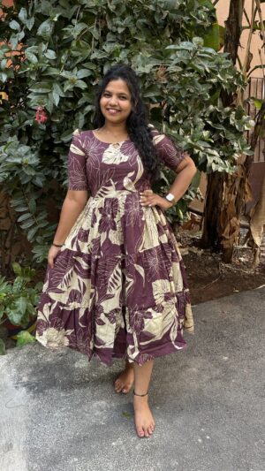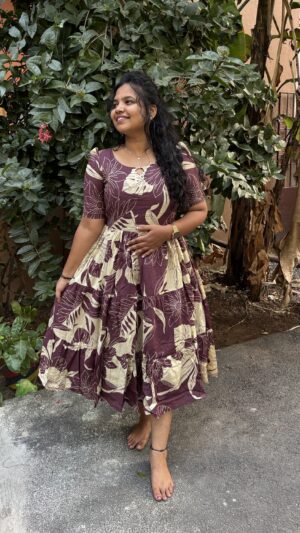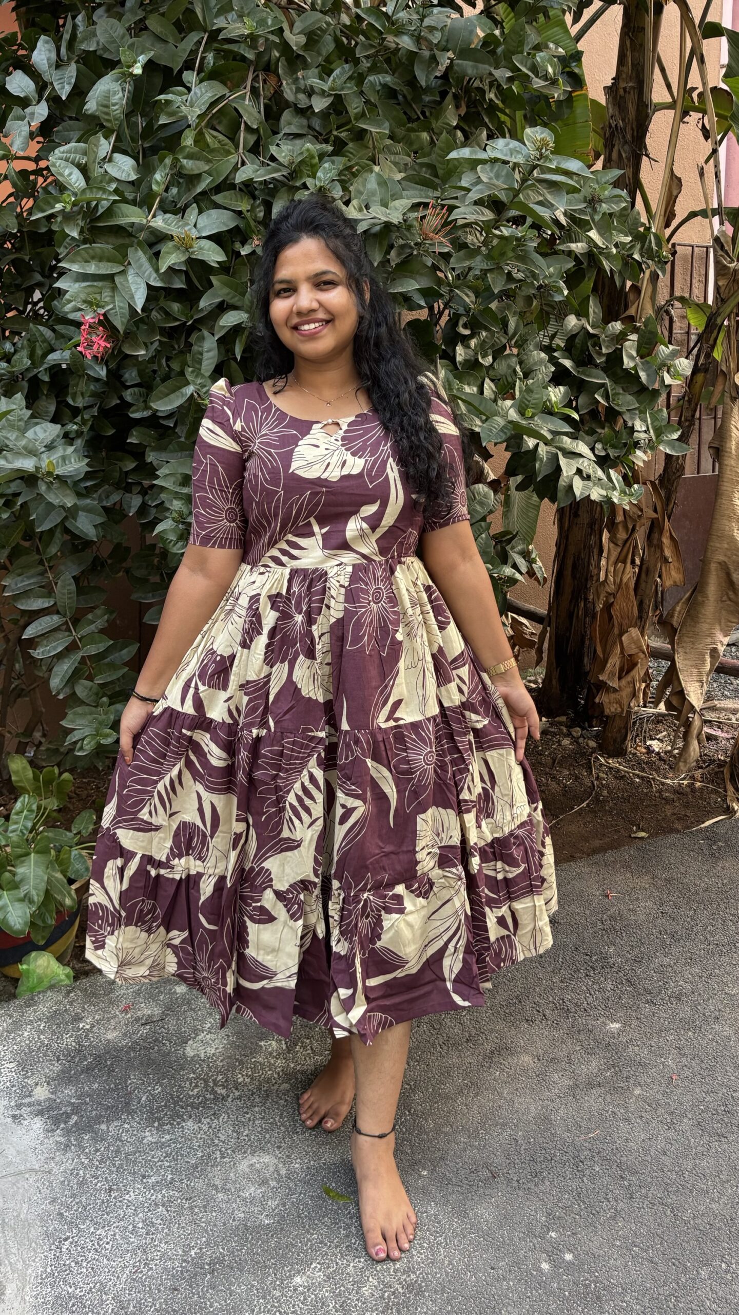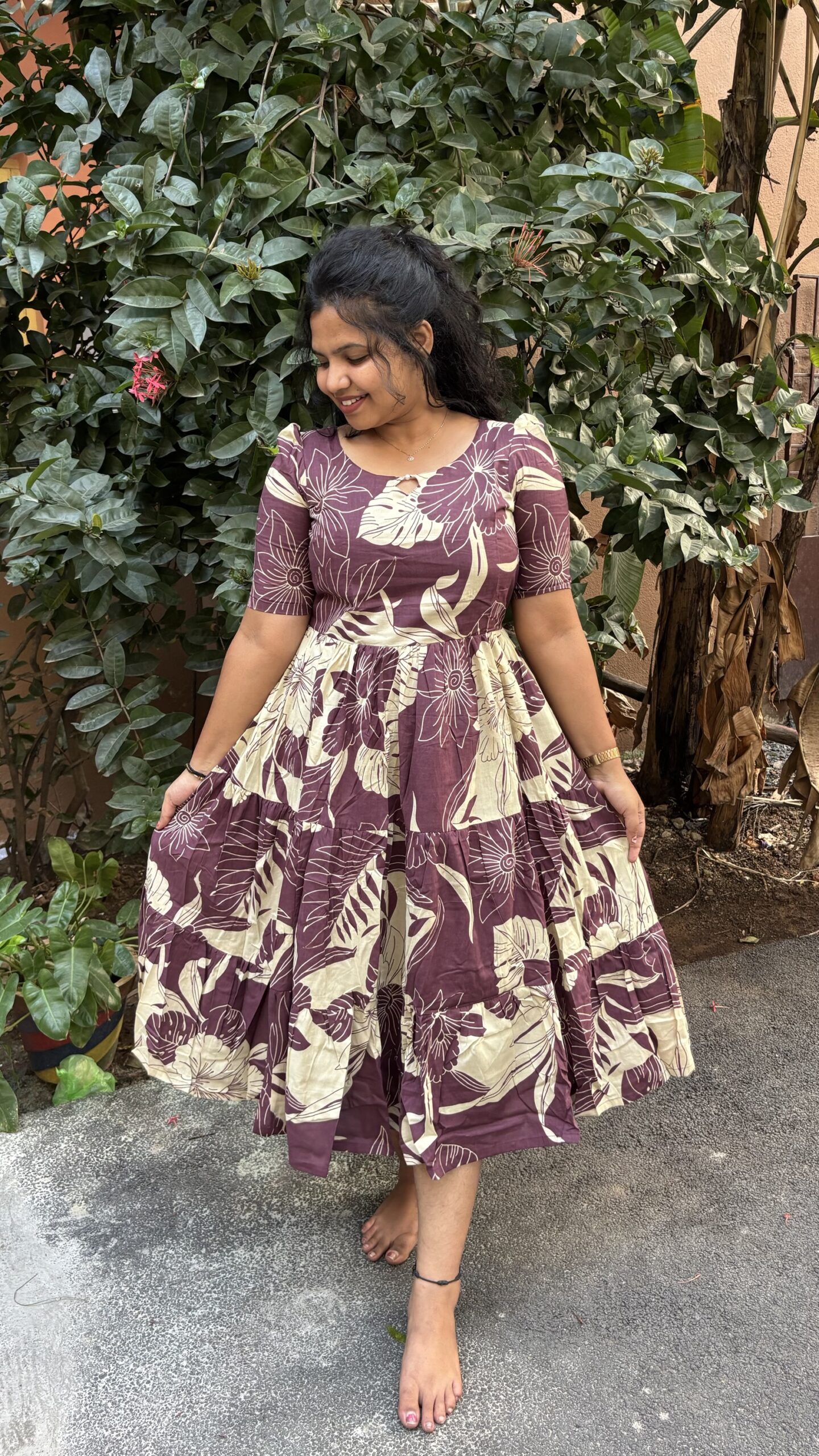 Crafted in breathable, skin-friendly cotton, this beautiful plum-toned dress features oversized floral prints in soft beige that create a bold yet graceful look. The fitted bodice with half sleeves enhances your silhouette, while the flared tiered skirt adds movement, charm, and that perfect twirl moment ✨