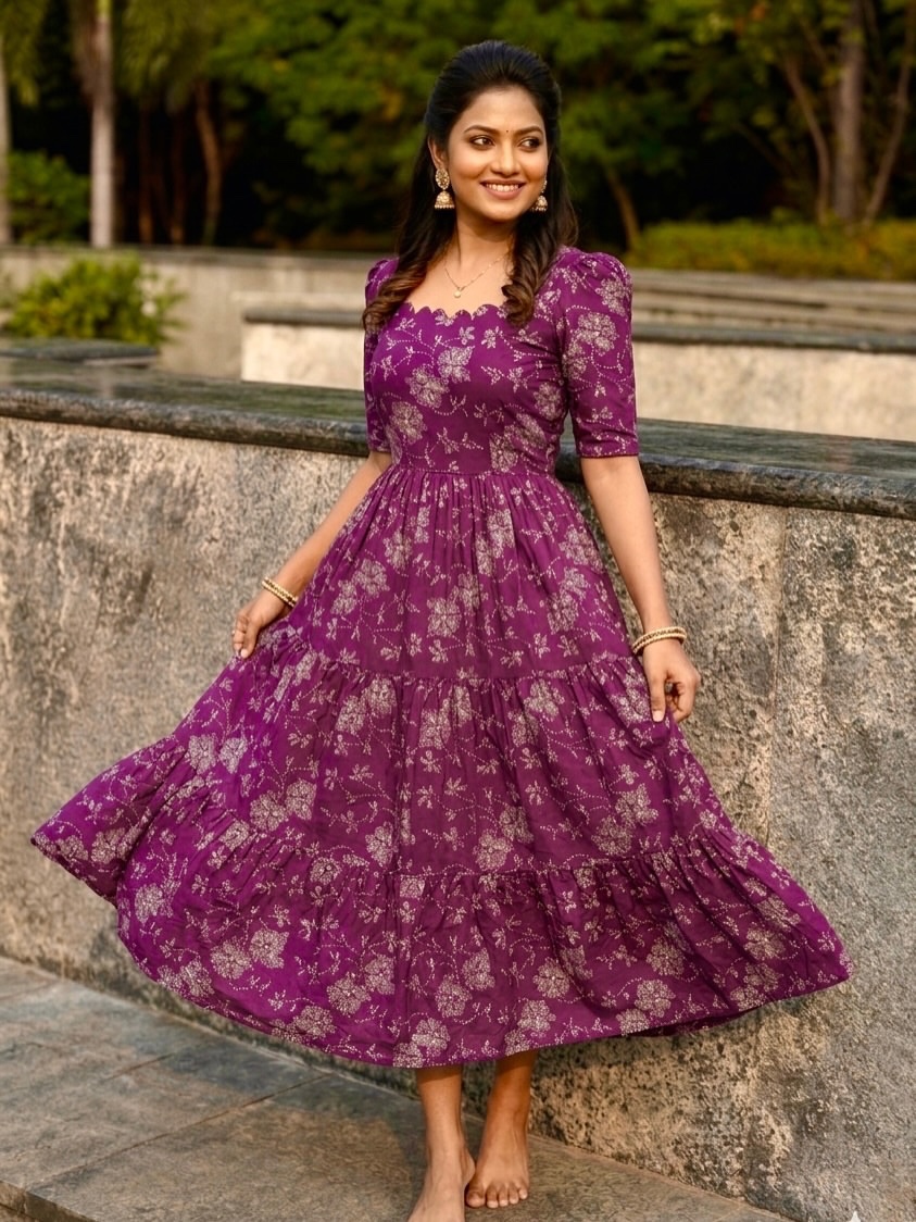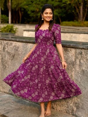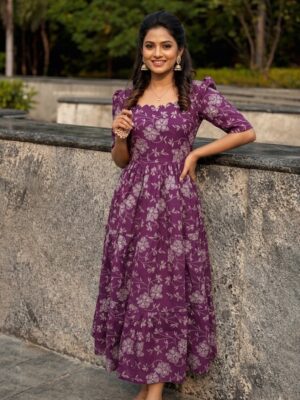 The rich purple shade with subtle floral detailing gives it a calm, elegant look, while the fitted top and relaxed, layered skirt create a shape that feels both flattering and comfortable. The neckline adds a gentle feminine touch without being too much.