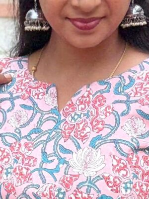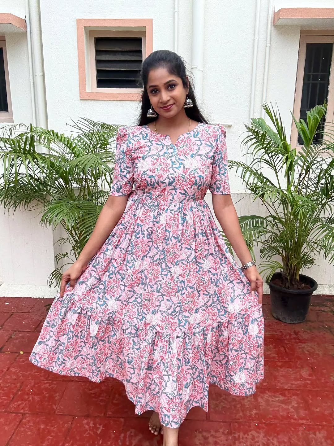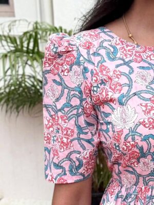 cotton floral dress, womenโs midi dress India, comfortable cotton dresses online, affordable womenโs clothing India, Raspberry by Gayathri dresses.