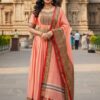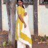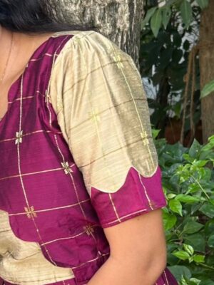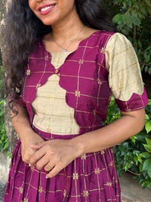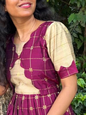 Make a statement in this elegant wine-colored Anarkali gown, beautifully designed with golden checkered motifs and a contrasting beige scallop yoke. Crafted in a soft and breathable cotton blend, this dress is stylish yet comfortable – perfect for festive occasions, family gatherings, or casual evening outings.