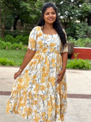 A vibrant yellow floral print on a fresh white base – perfect for brunch dates, casual outings, or festive days!