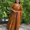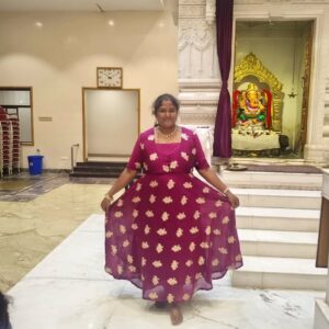 Wine floral maxi dress, designed for comfort and grace. Crafted from premium breathable fabric, it features delicate golden floral motifs that add a festive sparkle to your look. Perfect for temple visits, family functions, and festive gatherings, this outfit beautifully blends traditional charm and modern comfort.
